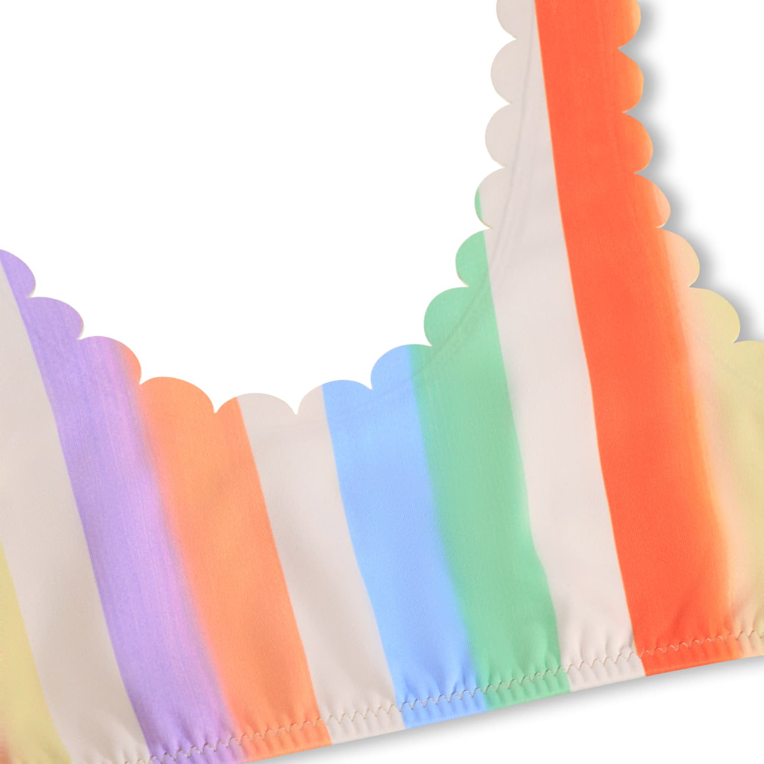 Breng kleur en stijl naar het strand met de Nolina bikini, een echte eyecatcher! Deze low-waist bikini combineert een beige basis met een speels gestreept regenboogpatroon en een gewelfde afwerking.