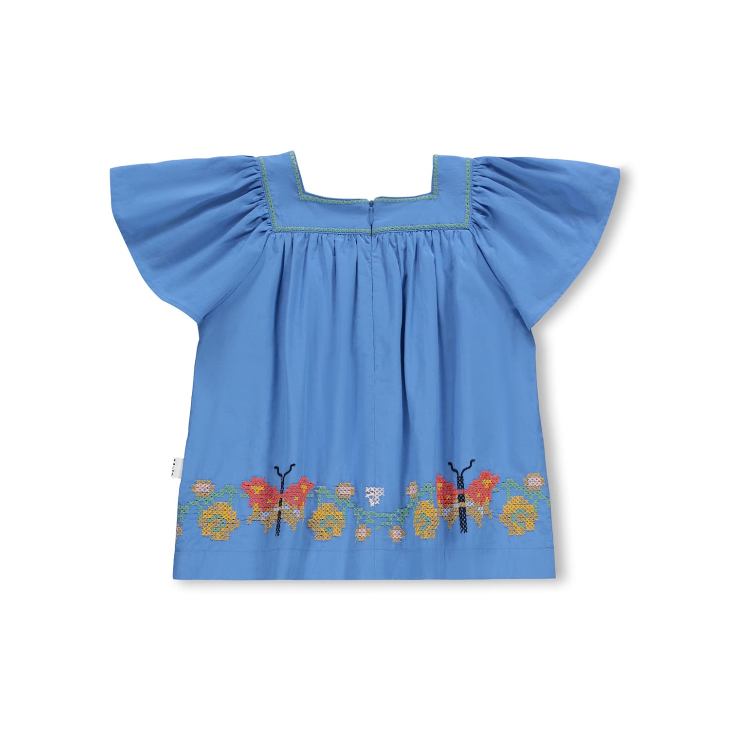 Blauw shirt van zachte katoen met een elegante vierkante hals en speelse vlindermouwen. Dankzij de subtiele, onzichtbare rits aan de achterkant trek je het shirt moeiteloos aan en uit. De kleurrijke, geborduurde vlinders langs de randen geven het geheel een vrolijke en unieke uitstraling. Leuk te combineren met de bijpassende Ally short voor een complete look!